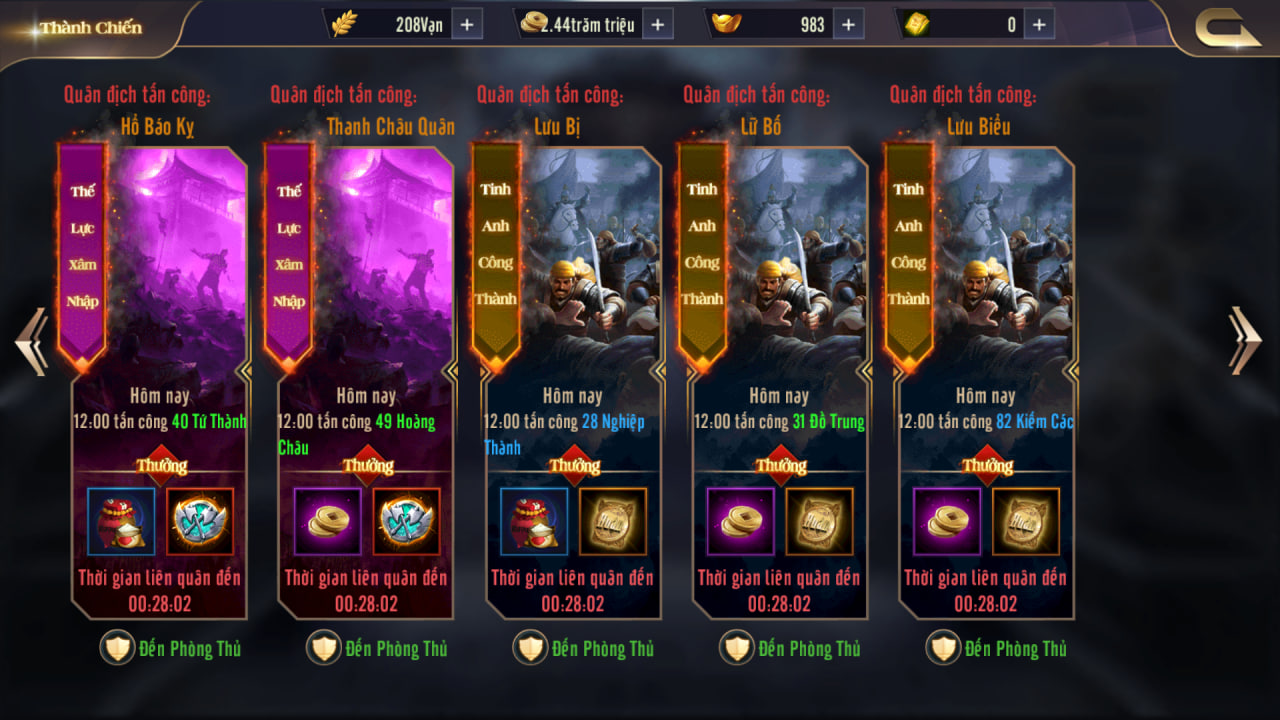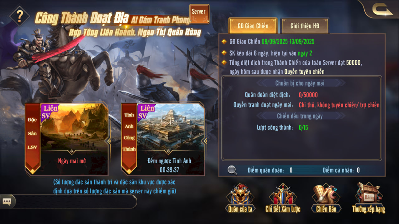 - 3. Quyền tuyên chiến: tổng số đội địch bị hạ trong Thành Chiến trong Server sẽ quyết định liệu quân đoàn có được quyền tuyên chiến ngày hôm sau không. Không đủ quyền chỉ có thể phòng thủ.