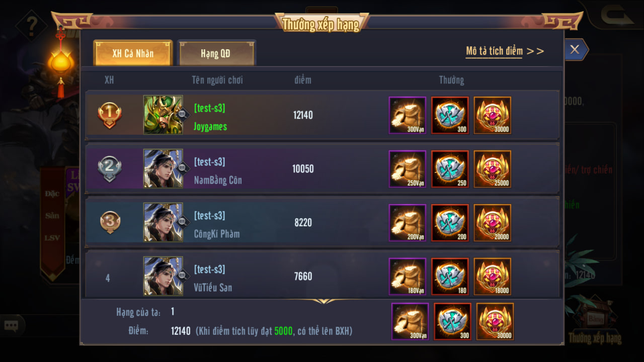 - 1. Thưởng cá nhân: Dựa trên xếp hạng tích điểm cá nhân. Phần thưởng sẽ được phát dần trong thời gian công bố sự kiện.