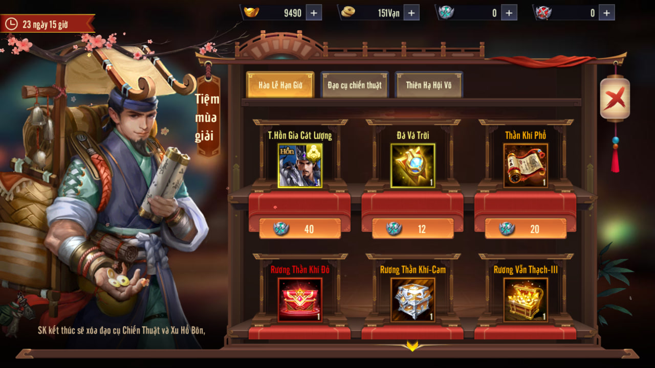 Có thể dùng Xu Hổ Bôn để đổi các đạo cụ hiếm từ Tiệm Mùa Giải: Mảnh Gia Cát Lượng, Đá Vá Trời, Truyền Thừa Đột Phá Đan, Đổi Sở Trường Đan, Ngự Long Lệnh