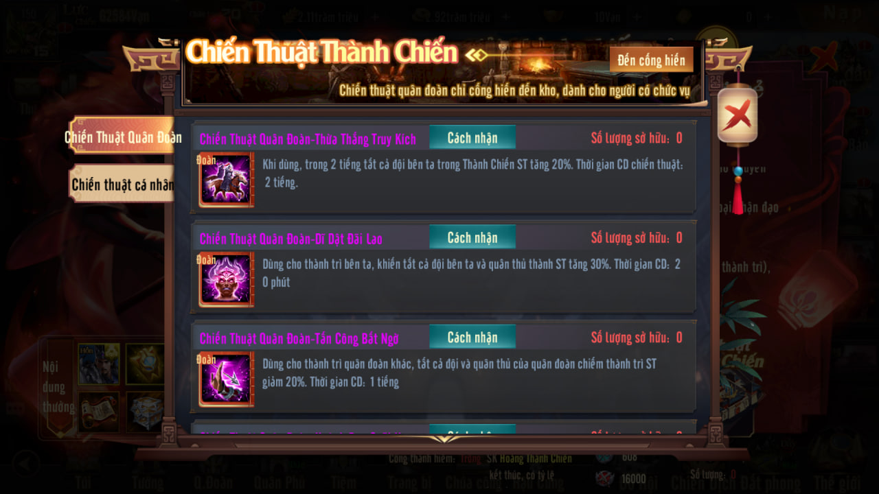 - 1. Đạo Cụ Chiến Thuật Quân Đoàn: các thành viên Quân Đoàn có thể cống hiến Đạo Cụ Chiến Thuật Quân Đoàn. Đoàn trưởng, Đoàn Phó có thể sử dụng các Đạo Cụ Chiến Thuật này trong Thành Chiến, tất cả thành viên đều được hưởng lợi