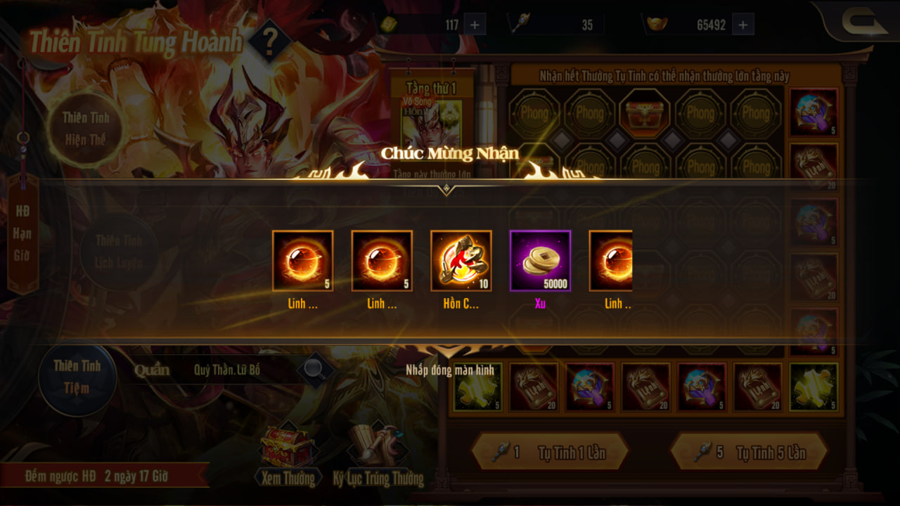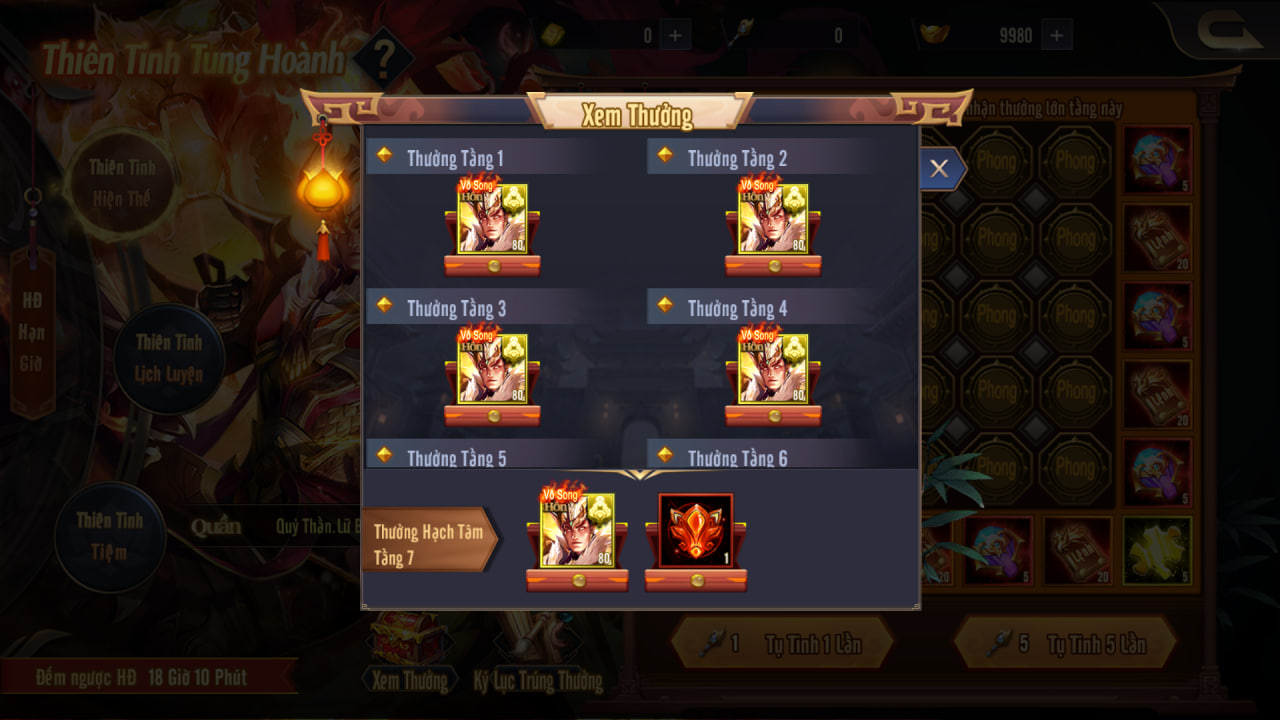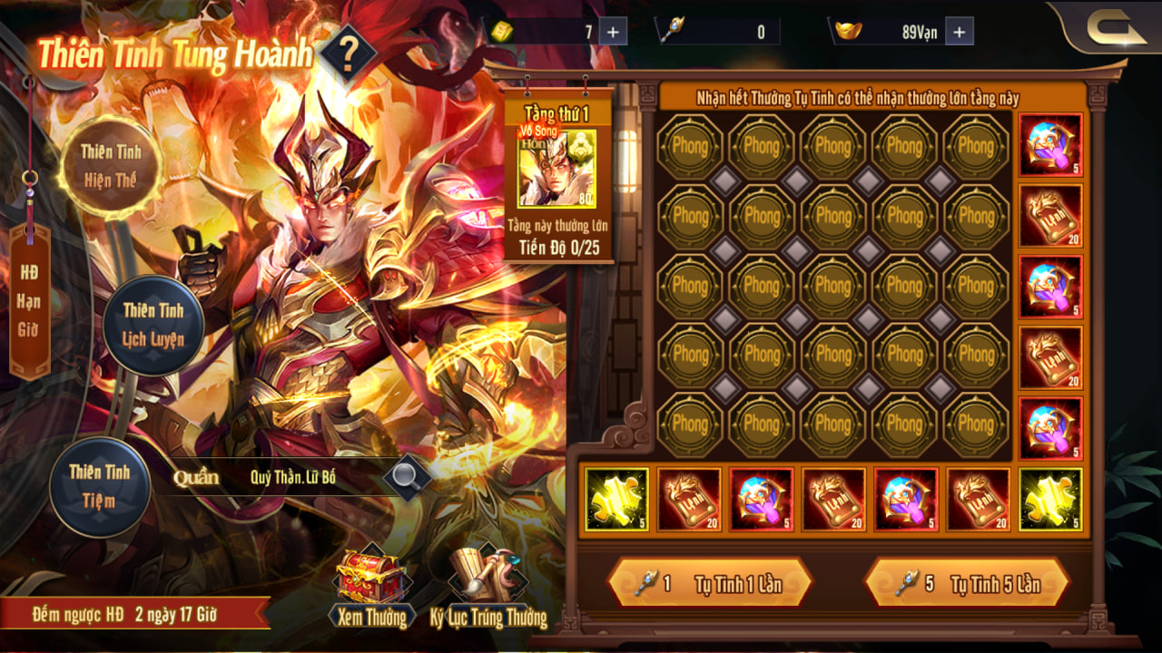 - 3. Sau khi Tụ Tinh hết các Thiên Tinh trong một tầng, sẽ nhận được giải thưởng lớn của tầng đó và có thể tiến vào tầng phần thưởng tiếp theo. Đặc biệt tầng 7 sẽ có danh hiệu Độc Quyền giúp kích hoạt kỹ năng. Tăng mạnh sức mạnh của Tướng.
