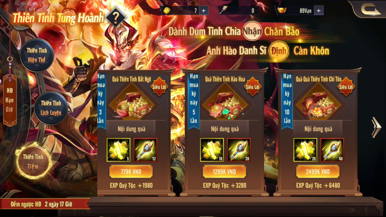 - Bán các gói ưu đãi Tụ Tinh Chìa. Chỉ có thể nhận Tụ Tinh Chìa thông qua Thiên Tinh Tiệm.