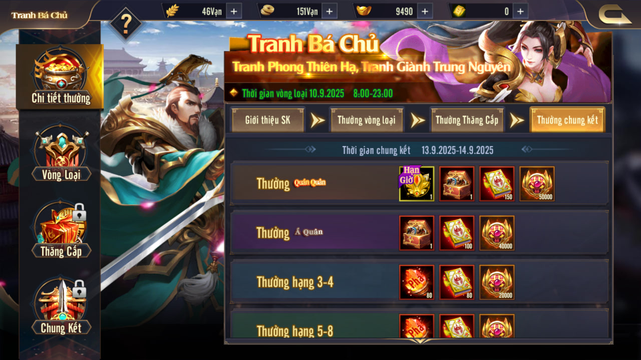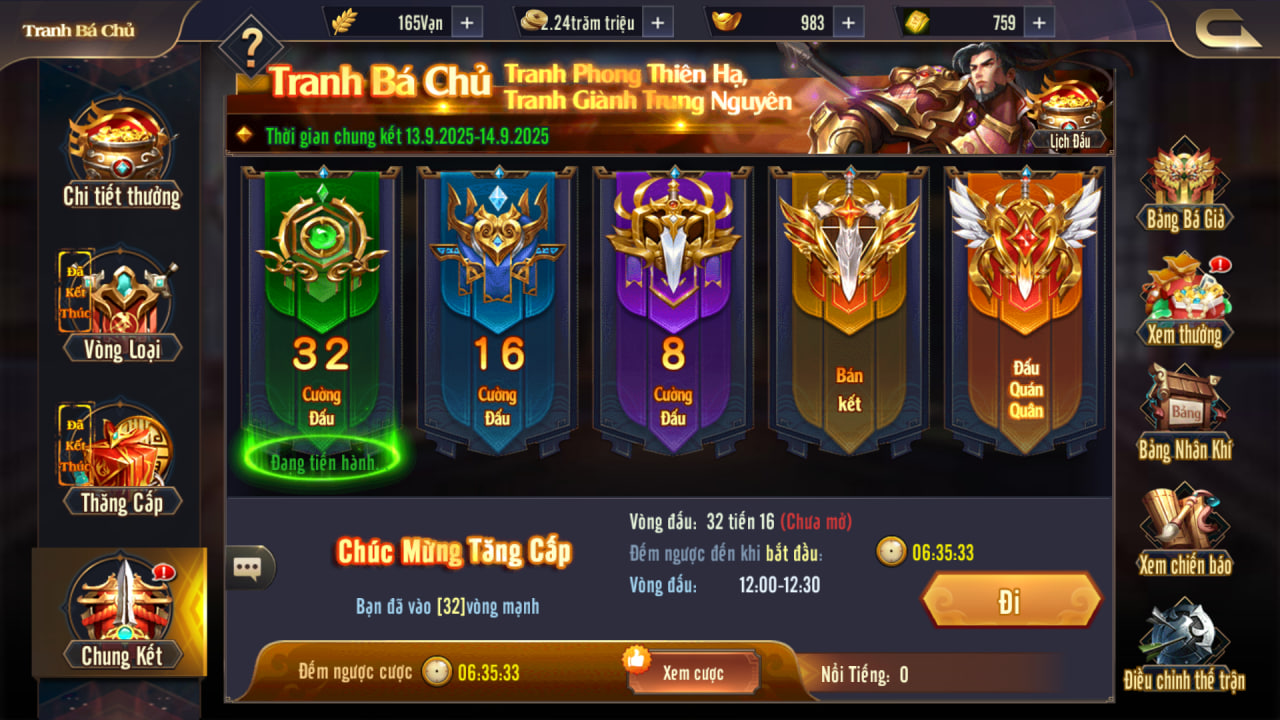 5. Vòng chung kết kéo dài 2 ngày (tùy quy mô sự kiện), do 64 Chúa công từ vòng thăng cấp tiến vào. Cuối cùng sẽ chọn ra 1 vị Vương giả mạnh nhất.