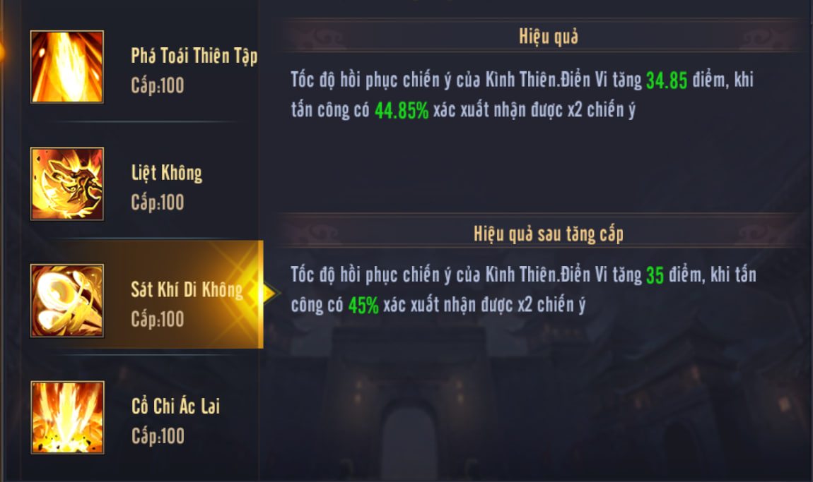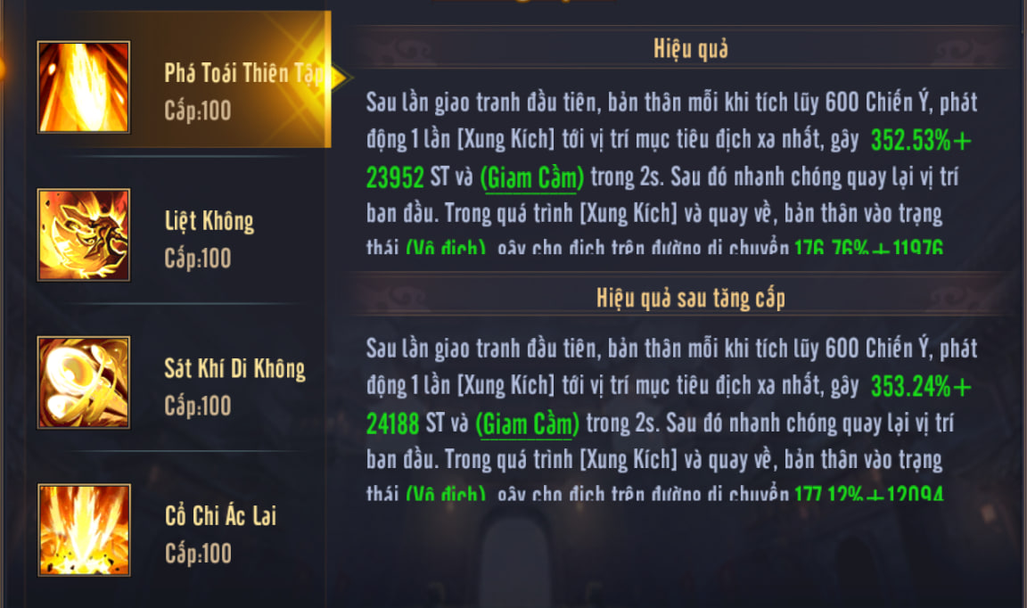 • - Mỗi võ tướng địch tử trận: thêm 3s thời gian duy trì, giảm 2s thời gian hồi chiêu. Tối đa duy trì 25 giây