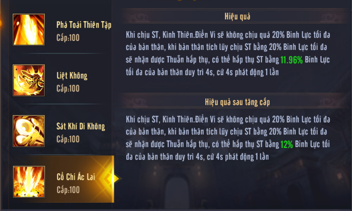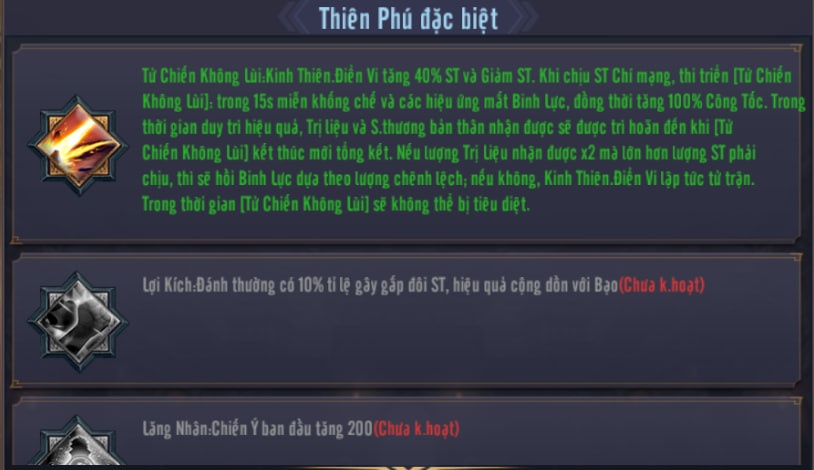 • - Thiên phú 1 cho hiệu ứng khóa máu khi hấp hối, đồng thời tăng mạnh sức chiến đấu