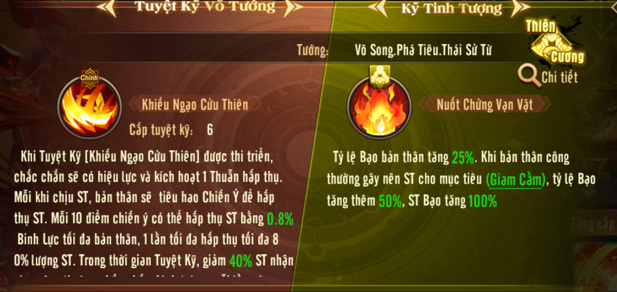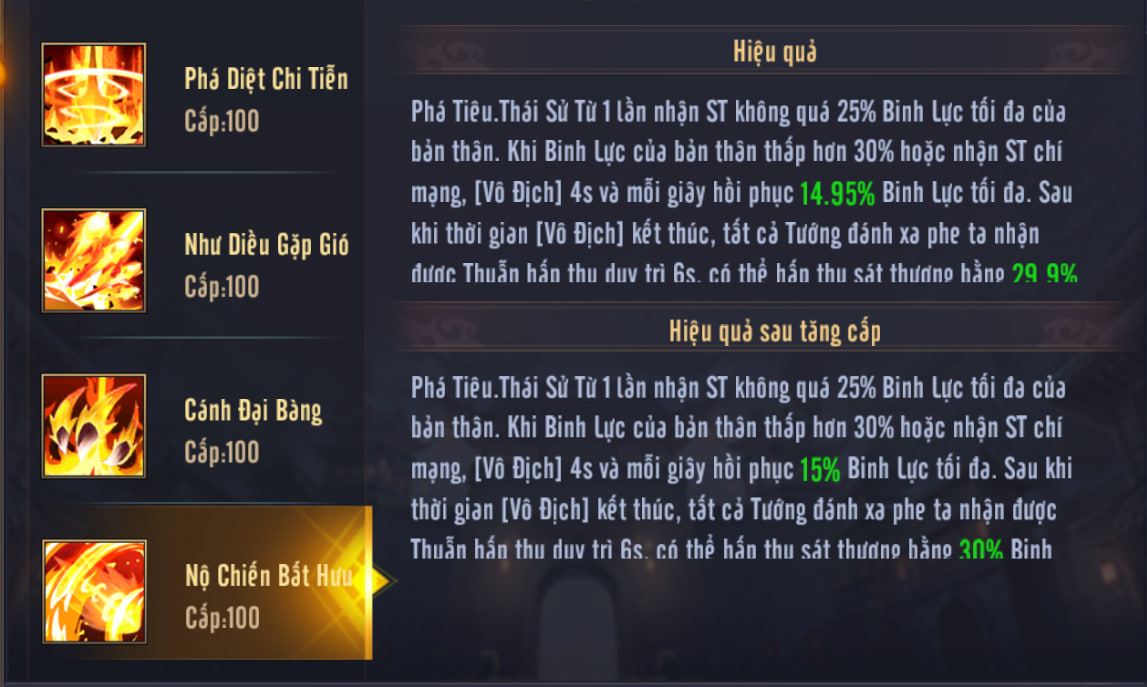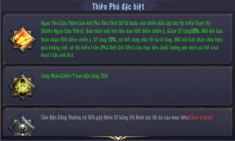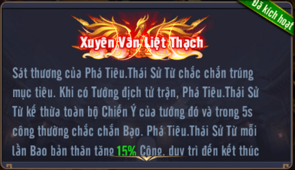 - 2. Khi có tướng trên sân tử trận, Thái Sử Từ hấp thụ toàn bộ chiến ý của họ, và trong 5 giây tiếp theo mọi đòn Công thường đều bạo kích.
