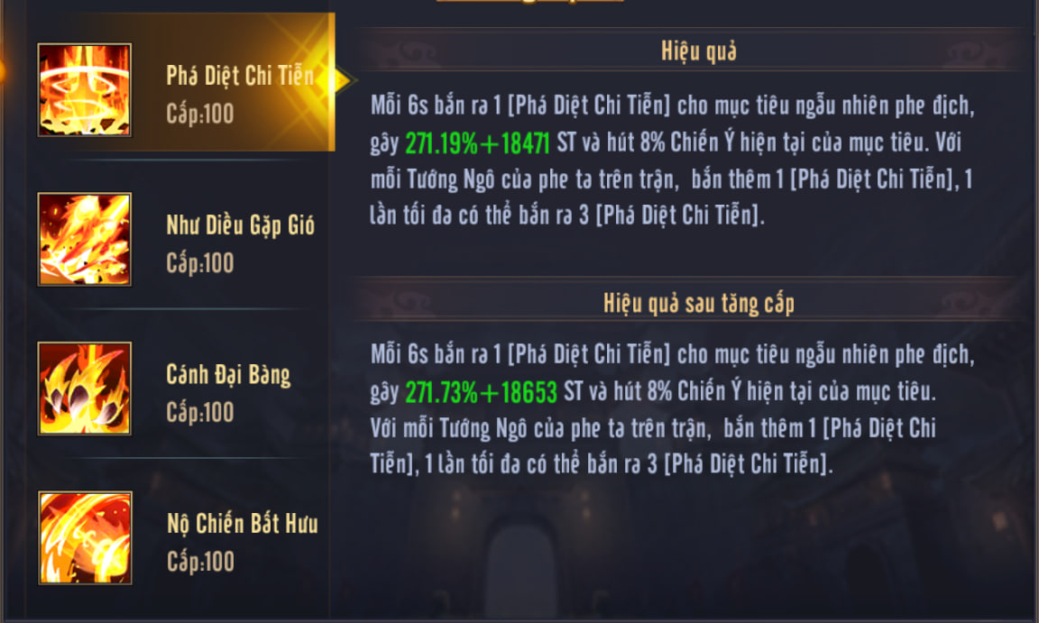 - 1. Mỗi 6 giây bắn 1 Phá Diệt Chi Tiễn vào mục tiêu ngẫu nhiên, hút 8% chiến ý hiện tại của mục tiêu.