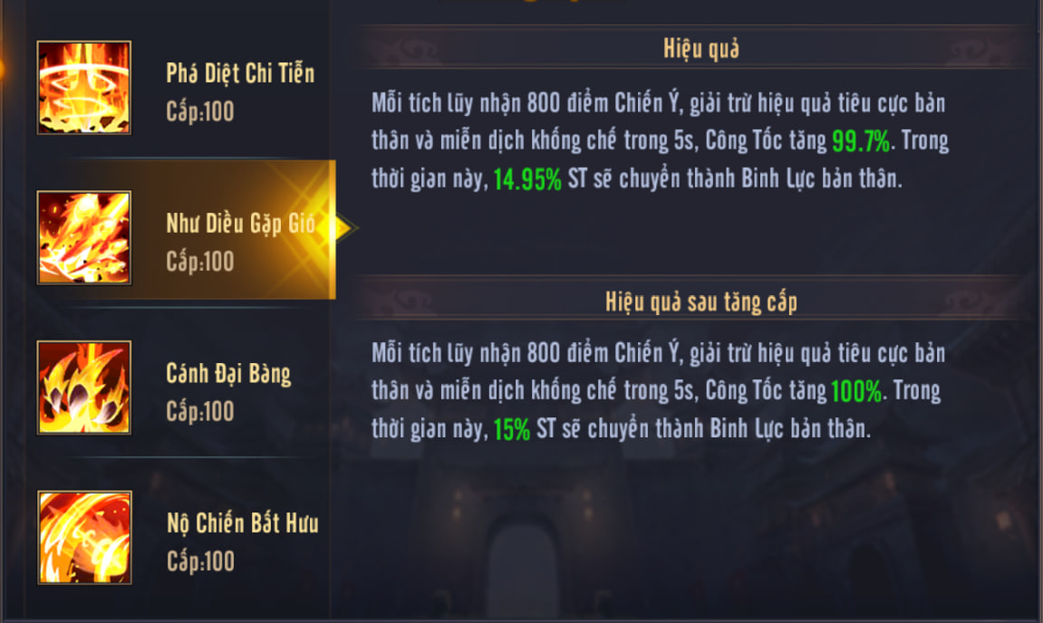 - 1. Mỗi khi tích lũy 800 chiến ý, xóa hiệu ứng xấu và miễn khống chế 5 giây.