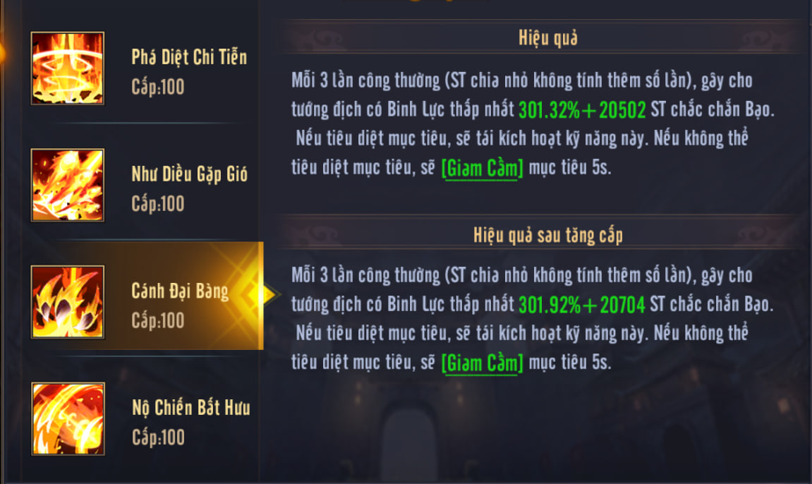 - 2. Nếu giết được, lập tức kích hoạt lại kỹ năng. Nếu không, khiến mục tiêu bị Giam Cầm 5 giây.