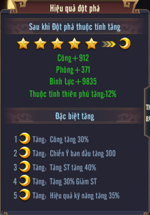 - 1. Mỗi 3 đòn Công thường, tấn công tướng địch có Binh lực thấp nhất bằng đòn Chắc chắn Bạo.