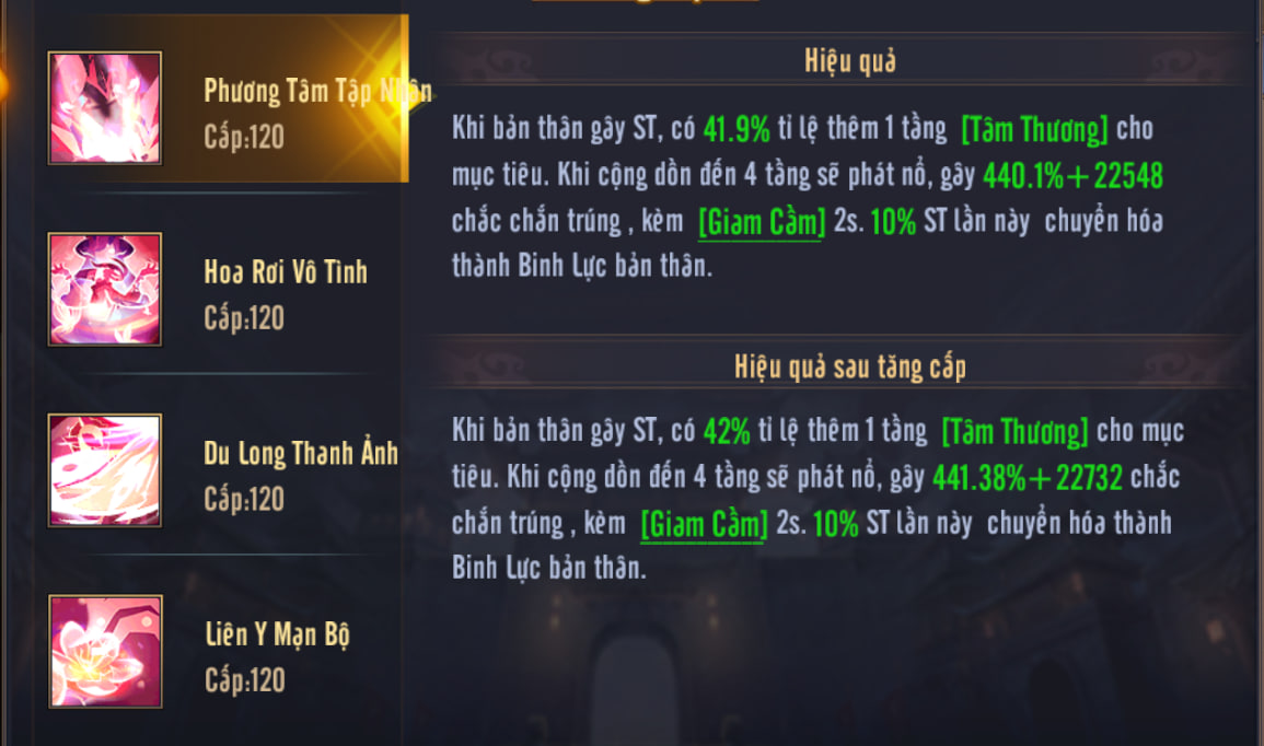 • - Nếu kích nổ Tâm Thương sẽ thi triển kỹ năng này 1 lần, tối đa 2 lần.