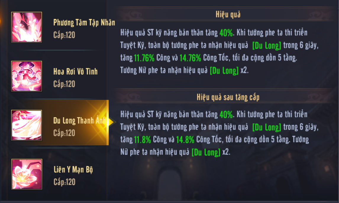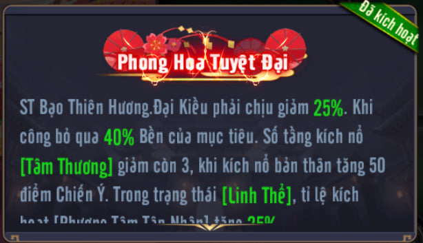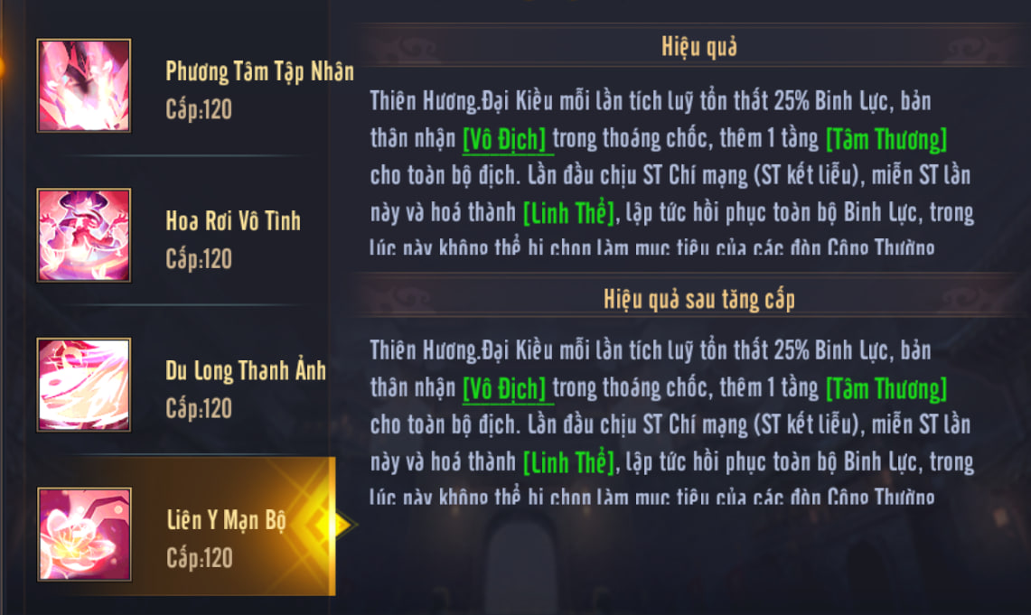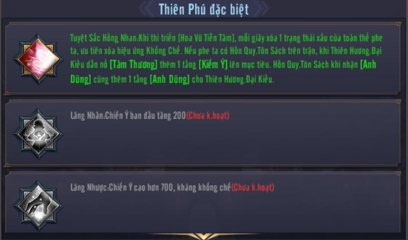 • - Mỗi lần đồng minh dùng Tuyệt kỹ, Buff toàn đội: