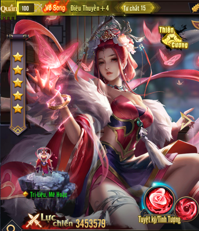 Phân tích: Sát thương của Tuyệt kỹ không phải là quan trọng nhất, mà là khả năng Mê Hoặc các Tướng. Hiệu quả phá vỡ đội hình địch là rất tốt, đặc biệt là với đội hình nhiều tướng hàng đầu. Nó dễ dàng giúp phe ta từ hàng đầu thâm nhập vào hàng sau của địch. Kỹ năng này cũng có thể làm gián đoạn sự phối hợp của đội địch.