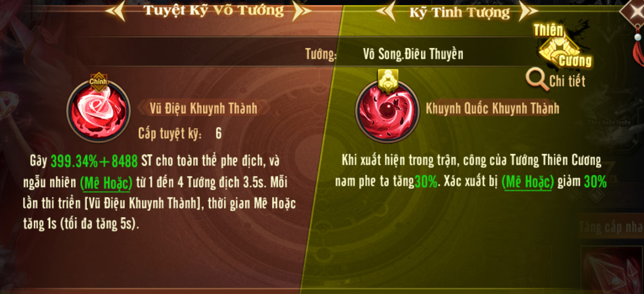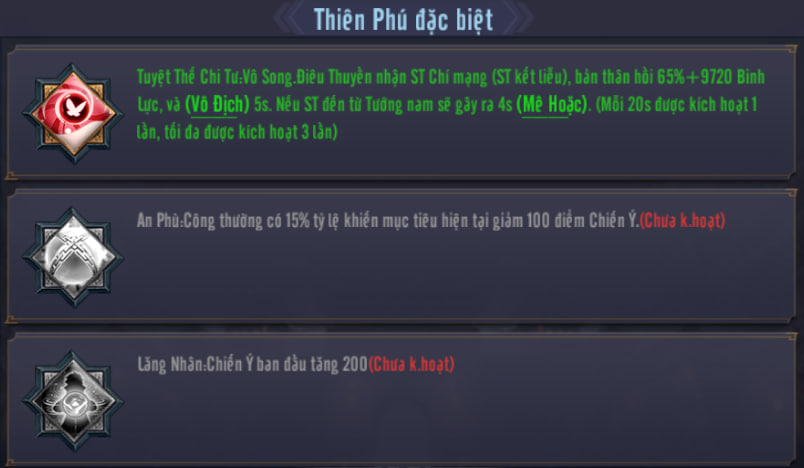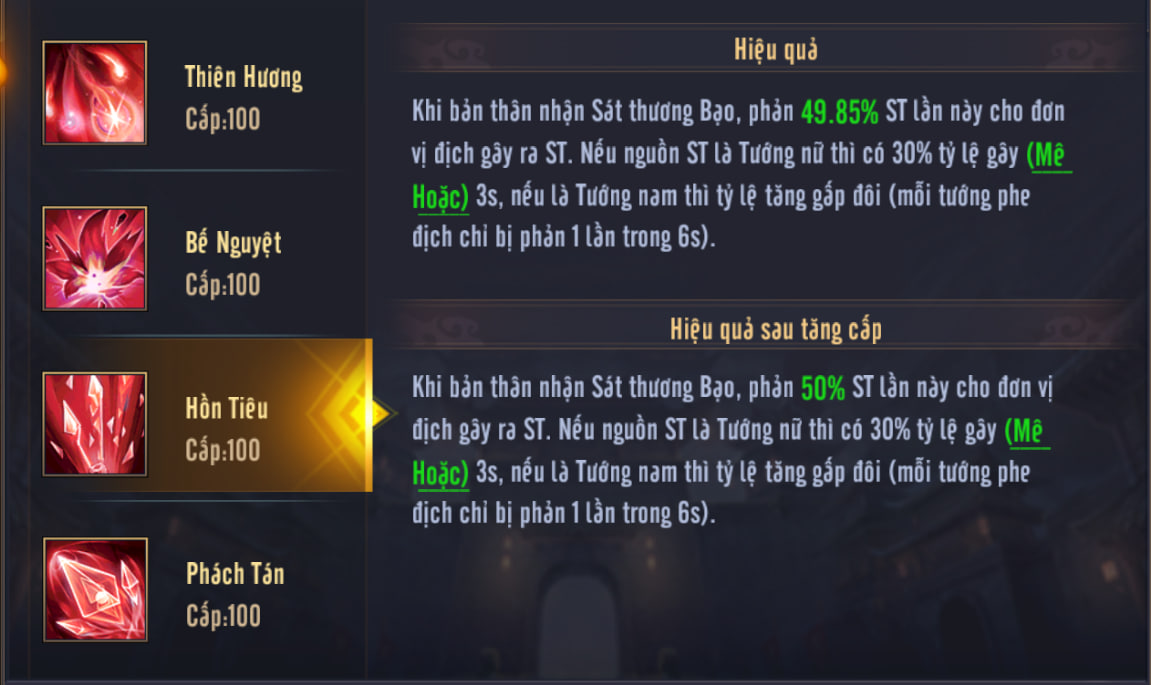 Phân tích: Thiên Hương và Tinh Tượng Kỹ mang lại hiệu ứng tăng cường rất mạnh mẽ cho các tướng Nam phe ta. Tăng 30% Công là mức tăng Công lớn nhất trong số tất cả các Kỹ Năng Bị Động hiện có, và khả năng gây sát thương Chắc chắn Bạo trong 4 giây sau khi tung Tuyệt kỹ cũng là một hiệu ứng cực kỳ bá đạo.