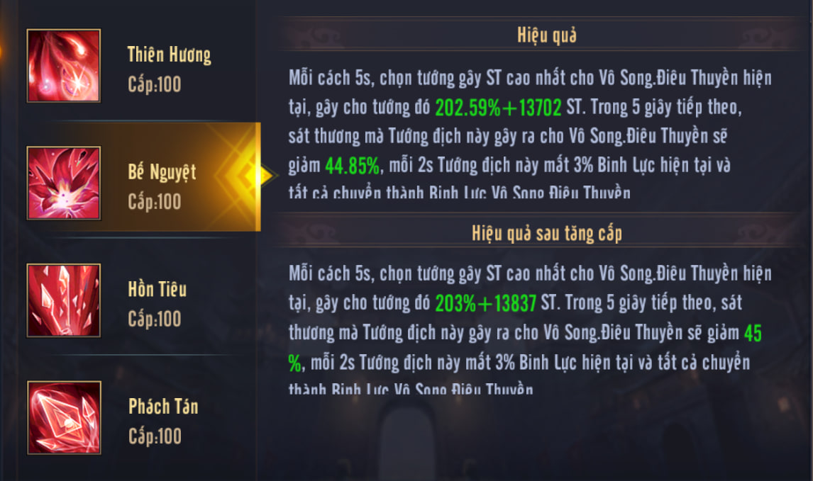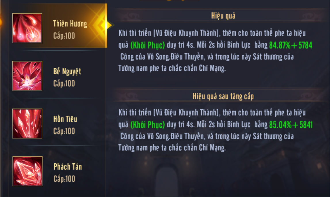 Tuyệt kỹ đồng thời có hiệu ứng Hồi Phục cho các tướng phe ta. Cứ mỗi 2 giây, hồi phục Binh Lực bằng hệ số Công của Vô Song.Điêu Thuyền, đồng thời tướng Nam phe ta gây sát thương sẽ Chắc chắn Bạo trong 4 giây.