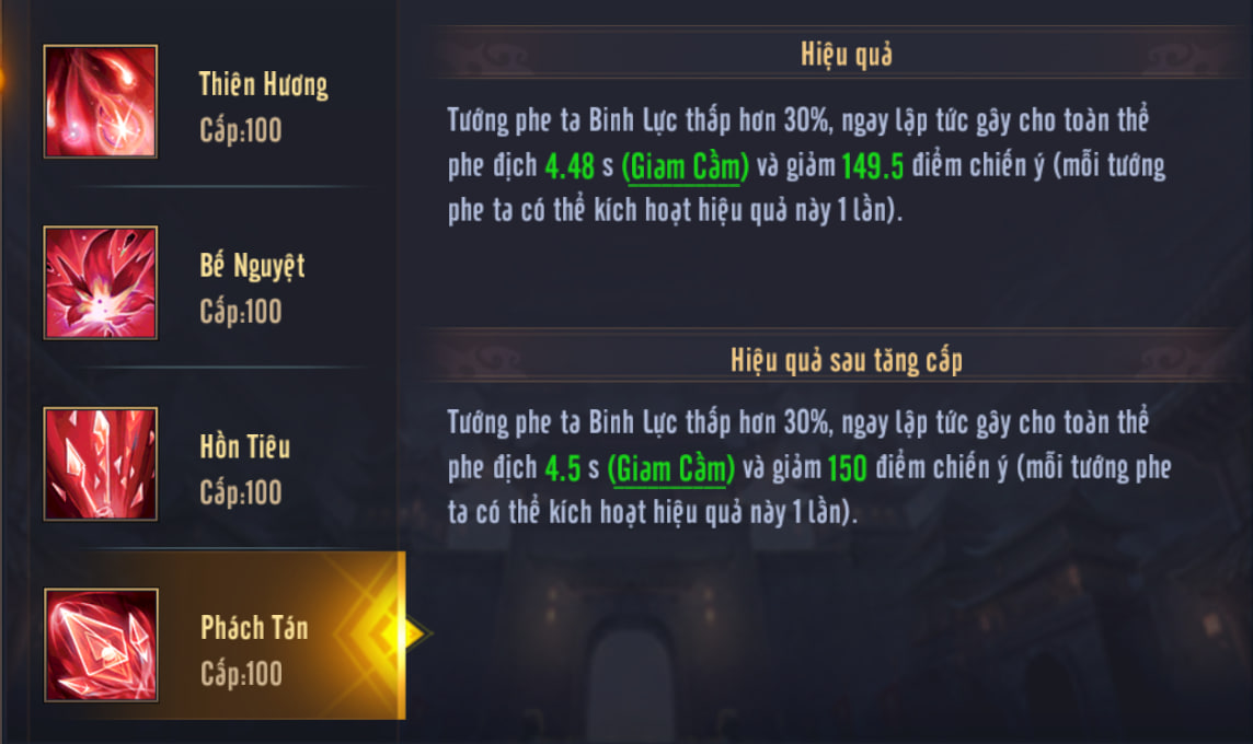 Phân tích: Kỹ năng này chủ yếu để khắc chế các đội hình gây sát thương đơn mục tiêu. Nếu đối thủ có đội hình gây sát thương diện rộng, có thể xảy ra trường hợp: cả 5 tướng phe ta đều bị dính sát thương diện rộng và giảm Binh Lực xuống dưới 30%, khi đó Phách Tán sẽ kích hoạt 5 lần. Tuy nhiên, thời gian Giam Cầm sẽ không cộng dồn mà chỉ làm mới, dẫn đến lãng phí hiệu ứng. Do đó, trạng thái lý tưởng nhất là các tướng phe ta lần lượt bị giảm Binh Lực xuống dưới 30% để tối đa hóa hiệu quả của Giam Cầm.