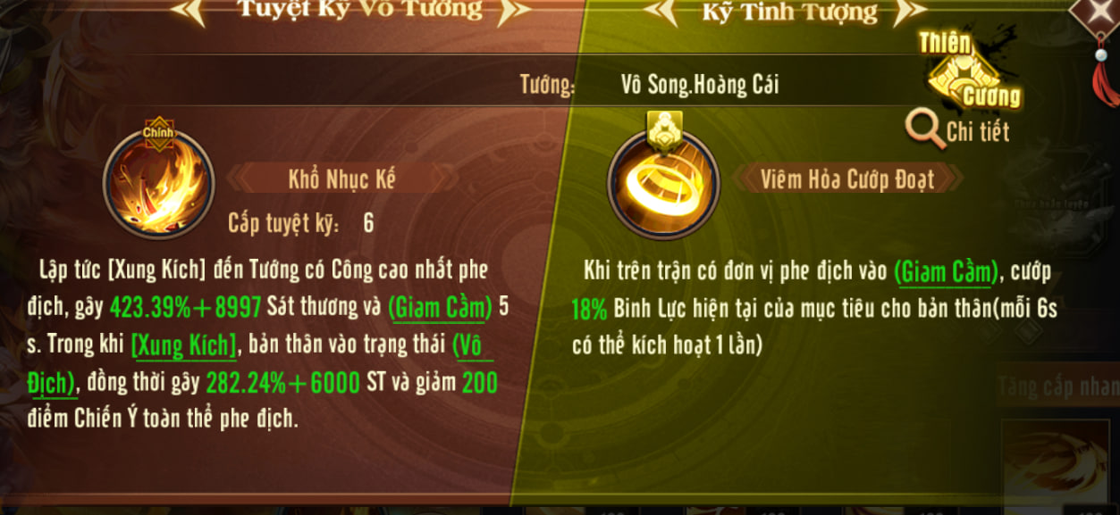 - 3. Với vai trò tướng đỡ đòn, chỉ số Giảm Sát Thương của Vô Song.Hoàng Cái đã đủ tốt. Ngoài ra, Thiên Phú 1 còn giúp ông hồi phục Binh Lực đã mất mỗi 2 giây, khả năng hồi phục cũng rất xuất sắc. Các kỹ năng chủ yếu xoay quanh Tuyệt kỹ - Khổ Nhục Kế để hồi Binh Lực và khống chế. Kỹ Năng 1 - Tráng Chí Lăng Vân giúp giảm tổng lượng Chiến ý cần thiết cho Tuyệt kỹ và cung cấp thêm khả năng hồi Binh Lực.