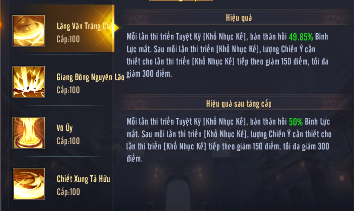 - 1. Mỗi lần tung Tuyệt kỹ - Khổ Nhục Kế, sẽ hồi phục một phần Binh Lực đã mất của bản thân.