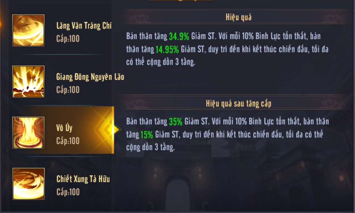 - 2. Cứ mỗi 10% Binh Lực bị mất, Giảm Sát Thương sẽ tăng thêm, tối đa thêm 3 tầng.