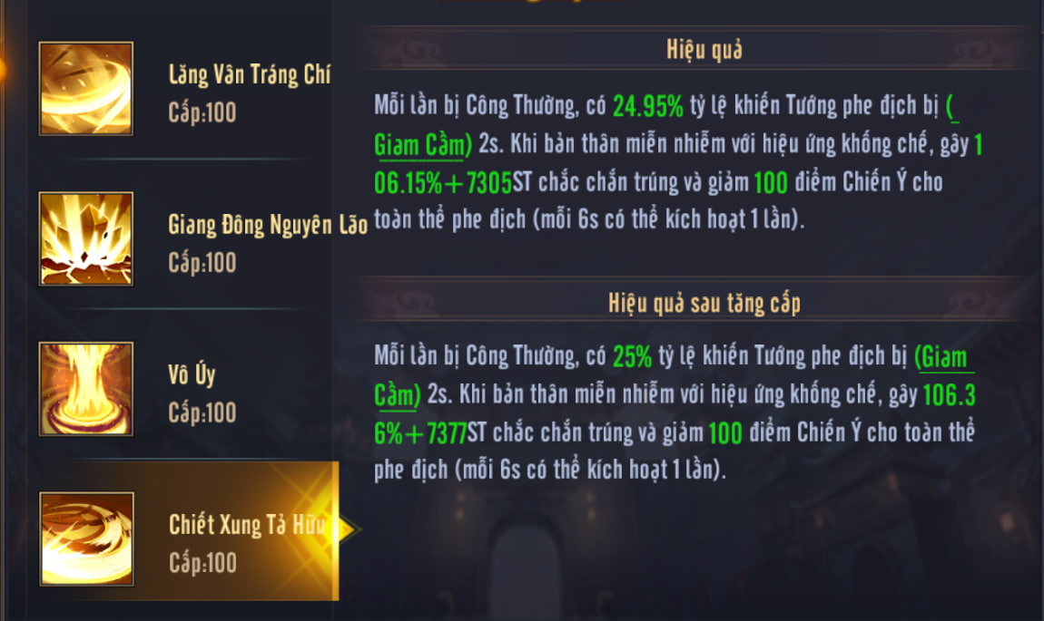 - 1. Mỗi lần bị Công thường, có khả năng Giam Cầm tướng địch đó trong 2 giây.