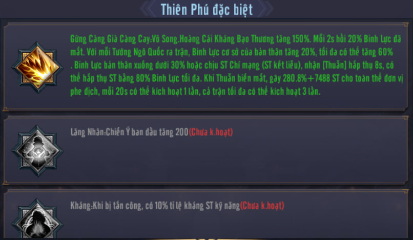 - 2. Cứ 2 giây, hồi phục 20% Binh Lực đã mất của bản thân. Mỗi khi có thêm một tướng Ngô Quốc trên sân, Binh Lực cơ bản của bản thân tăng 20%, tối đa 60%.