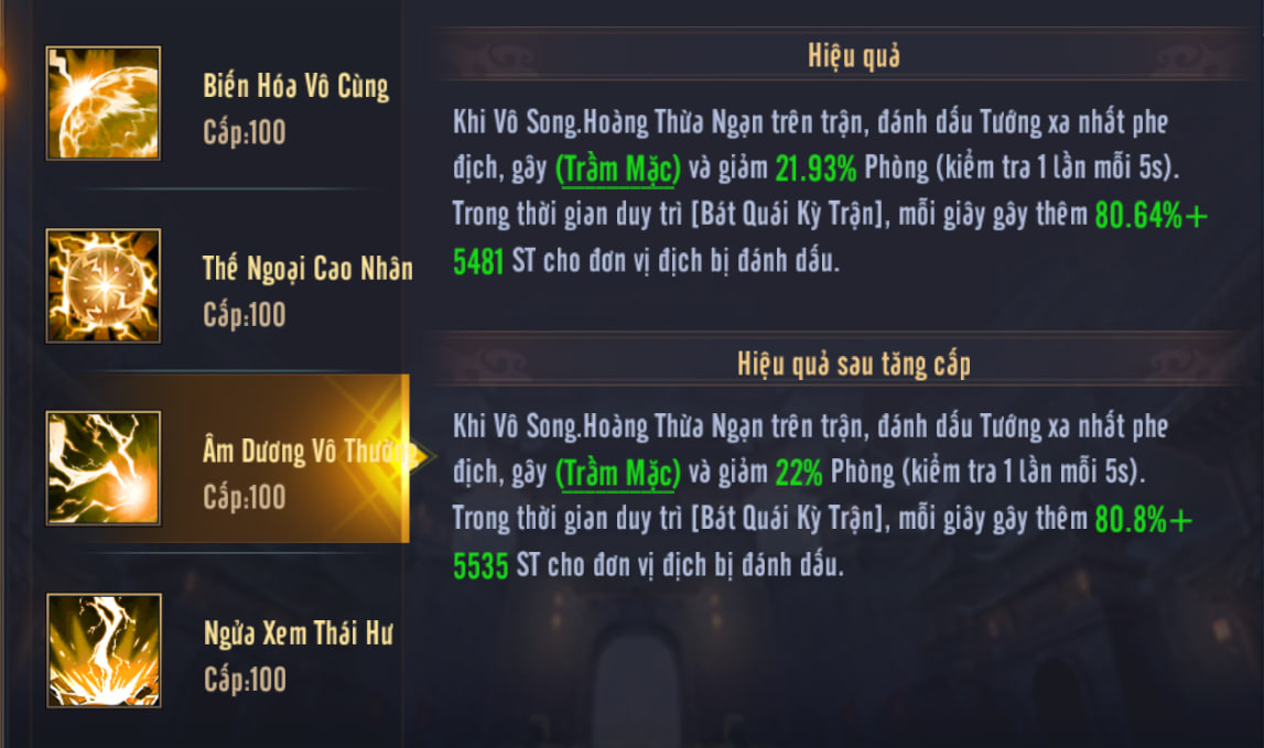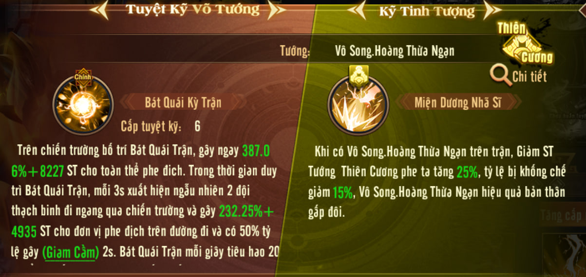 Khi Vô Song.Hoàng Thừa Ngạn còn sống, toàn bộ Tướng Thiên Cương phe ta được +25% giảm sát thương, +15% kháng khống chế. Bản thân Hoàng Thừa Ngạn nhận hiệu quả gấp đôi. (Hiệu ứng miễn khống này có thể cộng dồn với nguồn khác.)