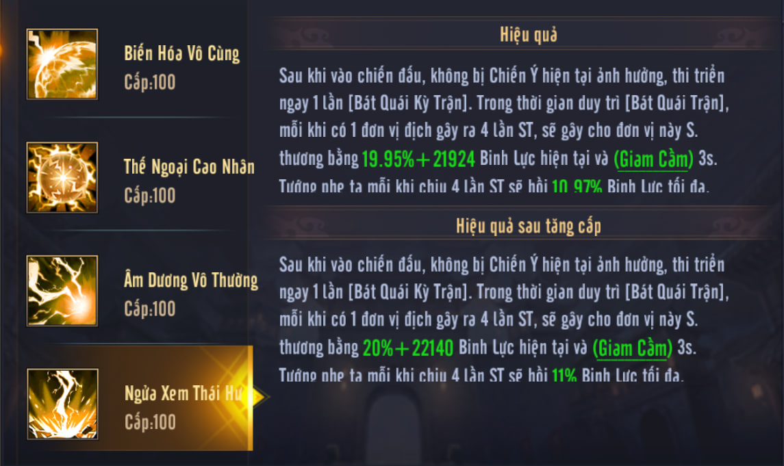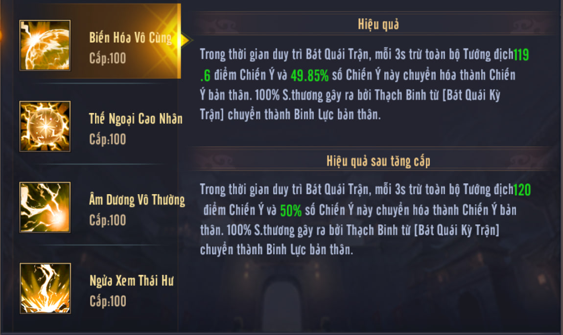 Trong thời gian tồn tại Bát Quái Trận, cứ mỗi 3 giây sẽ trừ chiến ý của toàn bộ địch, sau đó chuyển hóa % lượng chiến ý trừ được thành chiến ý cho bản thân.