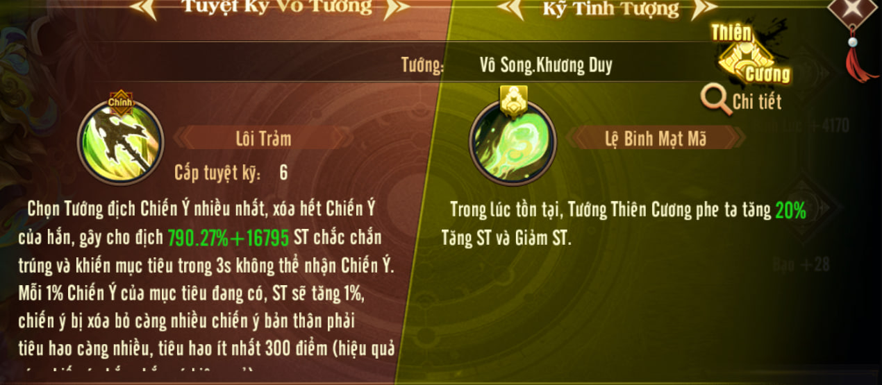 - 2. Dùng Tuyệt kỹ cần 1000 Chiến ý. Nếu mục tiêu chỉ còn dưới 300 Chiến ý, Khương Duy vẫn chỉ tốn 300 Chiến ý và sẽ dư lại phần còn lại.