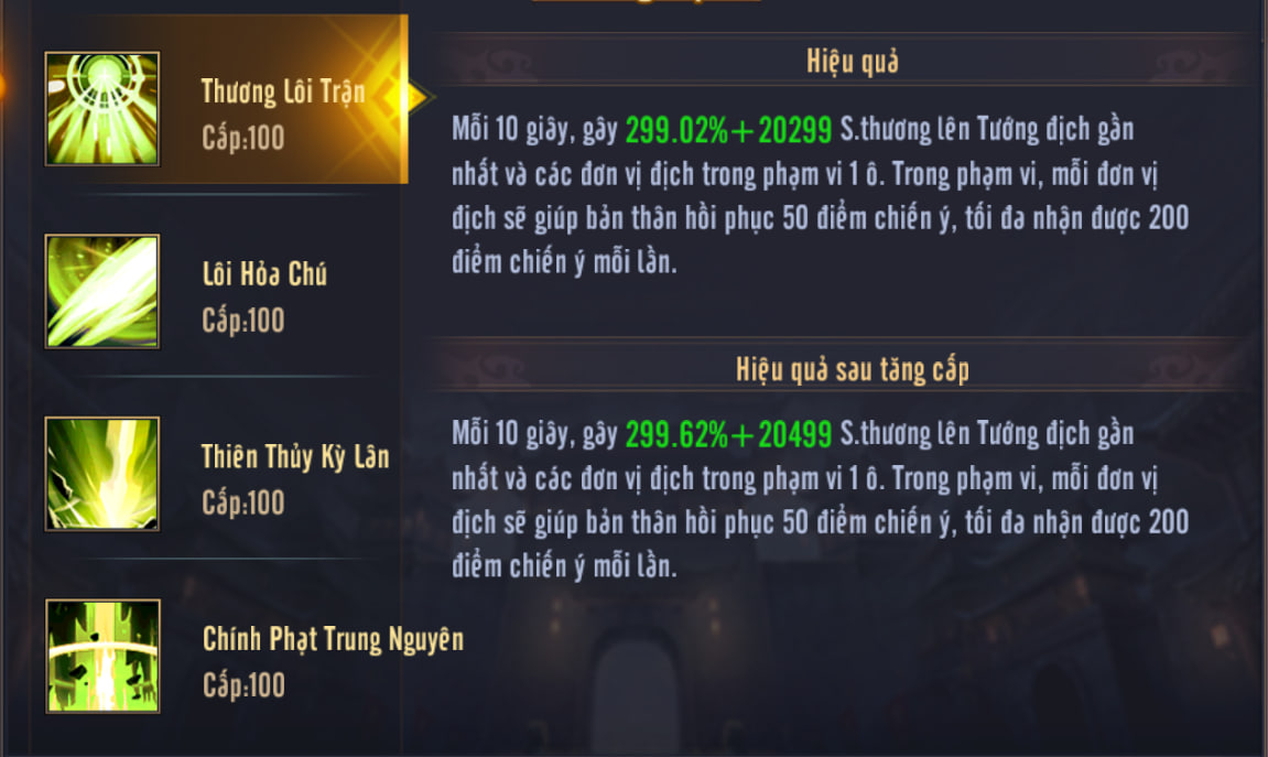 - 2. Mỗi 1% Chiến ý mà mục tiêu đang có sẽ tăng sát thương thêm 1%.
