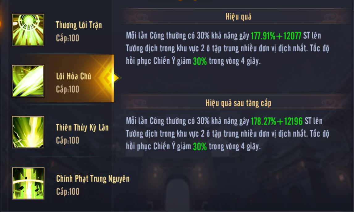- 2. Trong 4 giây, kẻ địch trong vùng đó giảm 30% hồi Chiến ý.