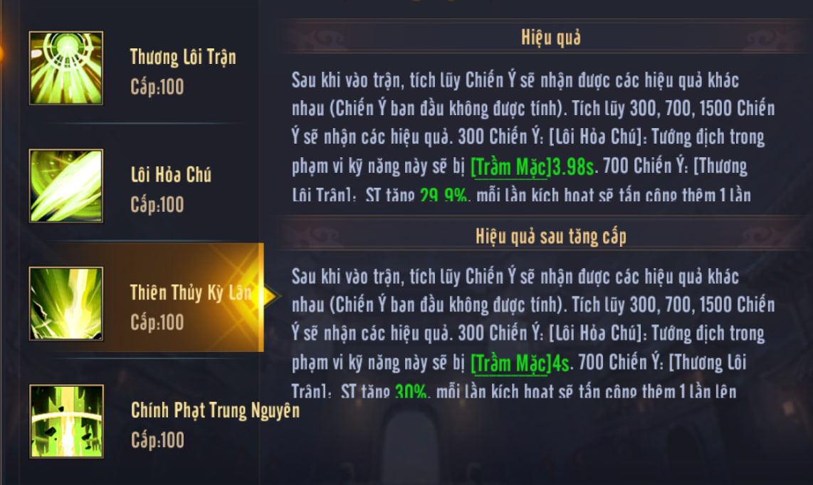 - 1. 300 Chiến ý: Kỹ năng 2 kèm thêm 5 giây Trầm Mặc.