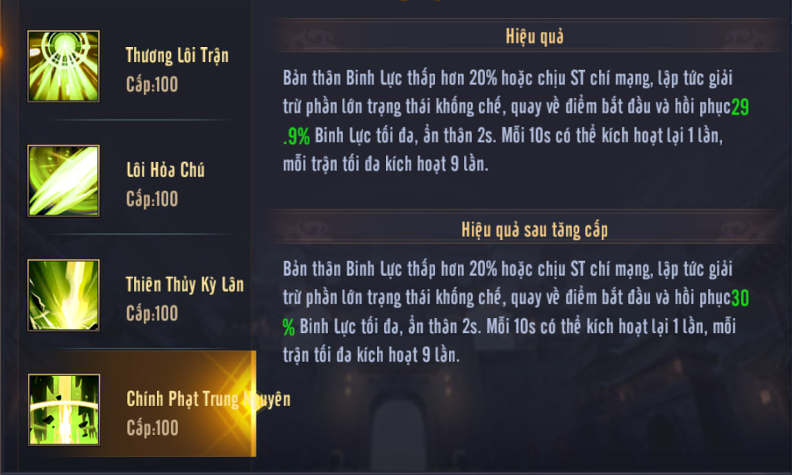 - Khi Binh Lực <20% hoặc sắp tử vong sẽ phát động.
