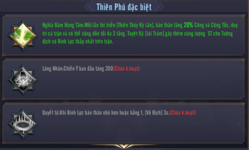 - 👉 Gợi ý: Thiên phú 1 bắt buộc lấy. Ưu tiên nâng tiếp Thiên phú 2 (+200 Chiến ý khởi đầu).
