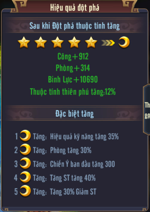 - Khuyên đột phá đến 3 trăng → khởi đầu +300 Chiến ý.