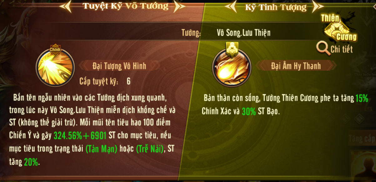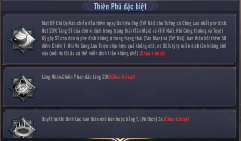 - 3. Công thường và Tuyệt kỹ của Vô Song.Lưu Thiện gây sát thương lên các đơn vị không có trạng thái Tản Mạn hoặc Trễ Nãi sẽ nhận thêm 50 điểm Chiến ý.