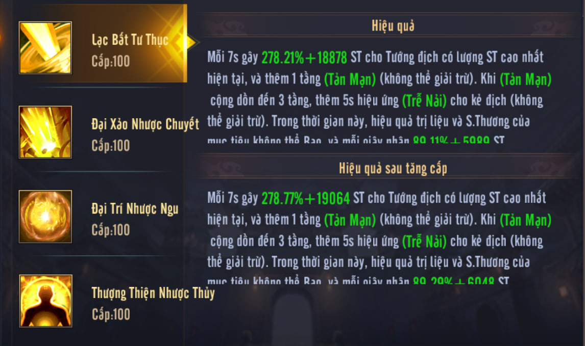 - 1. Cứ 7 giây, gây sát thương lên tướng địch có sát thương cao nhất và thêm một tầng Tản Mạn (không thể bị xóa bỏ). Khi Tản Mạn tích đủ 3 tầng, sẽ biến thành hiệu ứng Trễ Nãi trong 5 giây (không thể bị xóa bỏ).