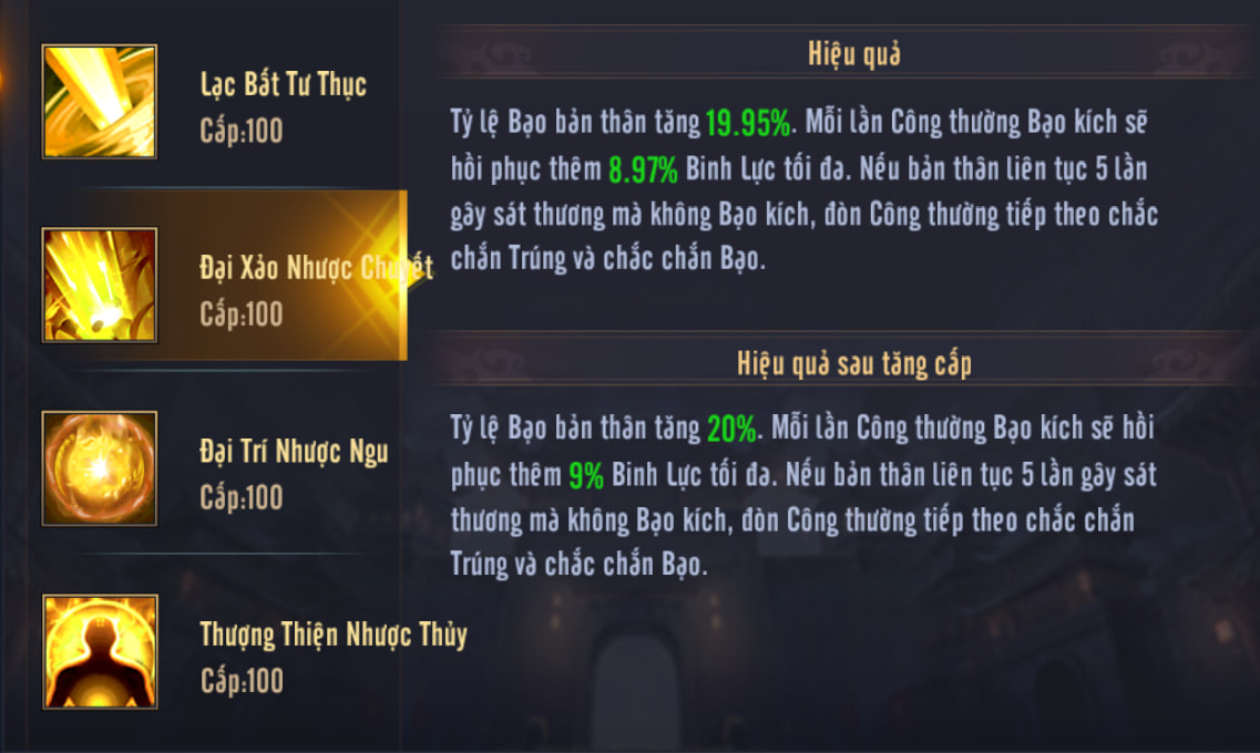 - 1. Tăng tỷ lệ Bạo của bản thân. Mỗi lần Công thường Bạo, sẽ hồi phục một lượng Binh Lực dựa trên Binh Lực tối đa của bản thân. (Kỹ năng này không có thời gian hồi chiêu ẩn).