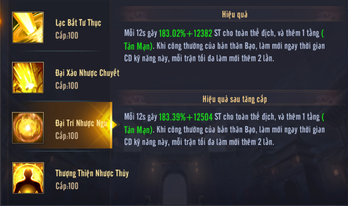 - 1. Cứ 12 giây, gây sát thương lên toàn bộ tướng địch và thêm 1 tầng Tản Mạn.