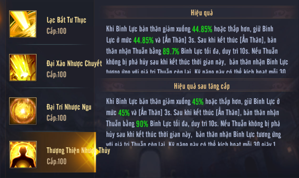 - 1. Khi Binh Lực bản thân giảm xuống một tỷ lệ nhất định, sẽ cưỡng chế giữ Binh Lực và ẩn thân trong 3 giây.