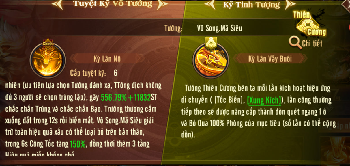 Khi có thương trên sân: Mã Siêu dịch chuyển tức thì đến thương, gây sát thương AOE quanh 1 ô, hồi Binh Lực. 5s hồi 1 lần.
