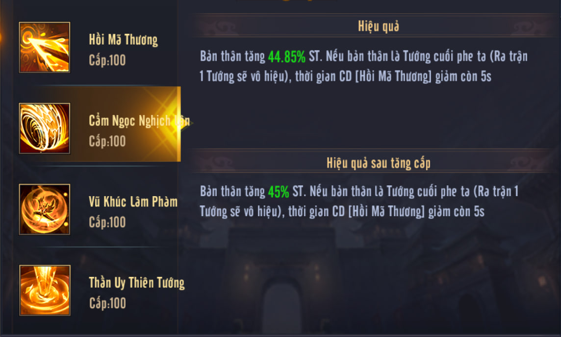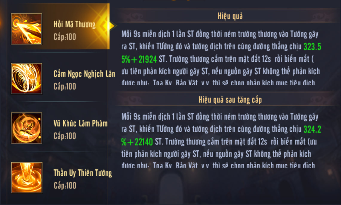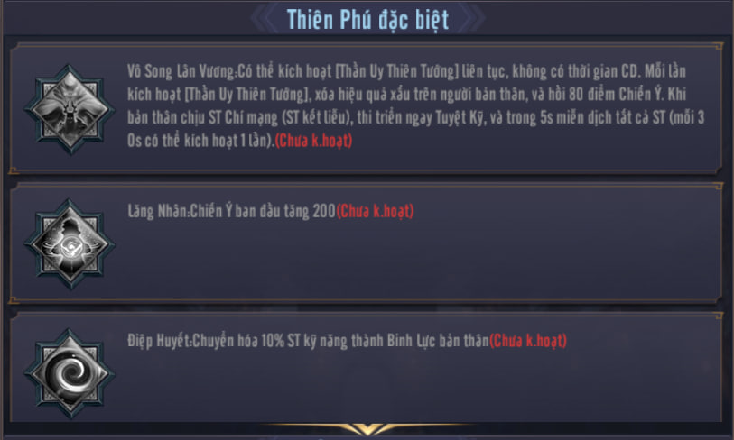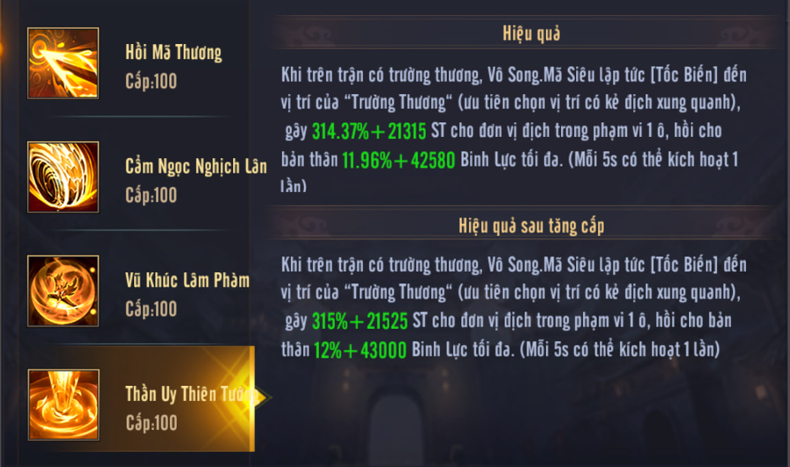 Khuyến nghị: Bắt buộc nâng Thiên phú 1. Ưu tiên Thiên phú 2 (+200 Chiến ý đầu trận). Tốt nhất nâng tối đa, Mã Siêu cực đáng để nuôi làm chủ lực.