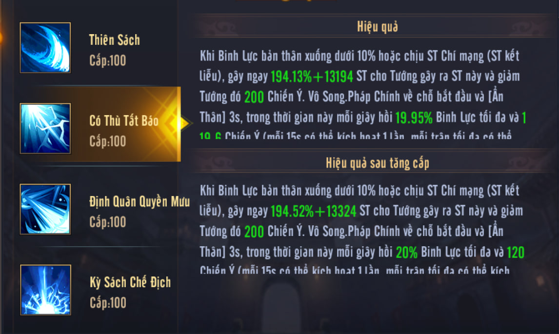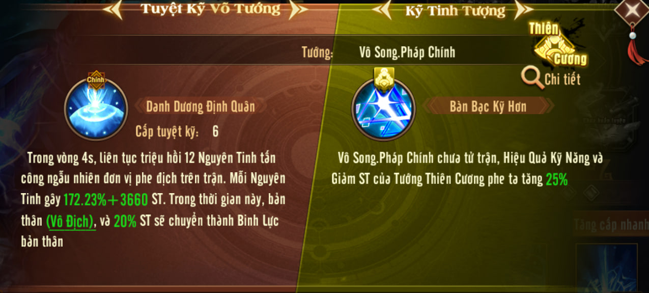 Chỉ cần Vô Song.Pháp Chính còn sống, toàn bộ Tướng Thiên Cương phe ta được tăng 25% hiệu quả kỹ năng và 25% giảm sát thương kỹ năng. Rất đơn giản nhưng cực mạnh.