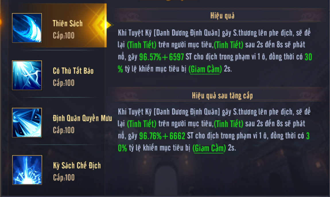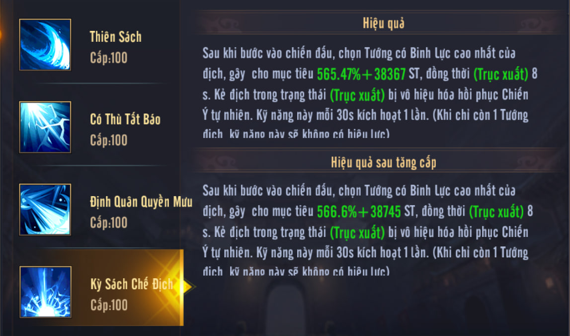 👉 Đây là 2 kỹ năng khắc chế Chiến Ý cực mạnh. Đặc biệt kỹ năng 3 vừa kìm hãm tốc độ ra chiêu của đối thủ, vừa giúp Vô Song.Pháp Chính có thêm Chiến Ý để tung Tuyệt kỹ nhiều hơn.
