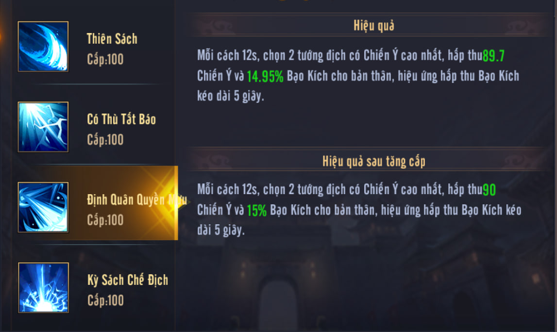 Mỗi 12 giây hấp thu Chiến Ý và Bạo của 2 tướng có Chiến Ý cao nhất bên địch, đồng thời gia tăng Bạo của bản thân trong 5 giây.