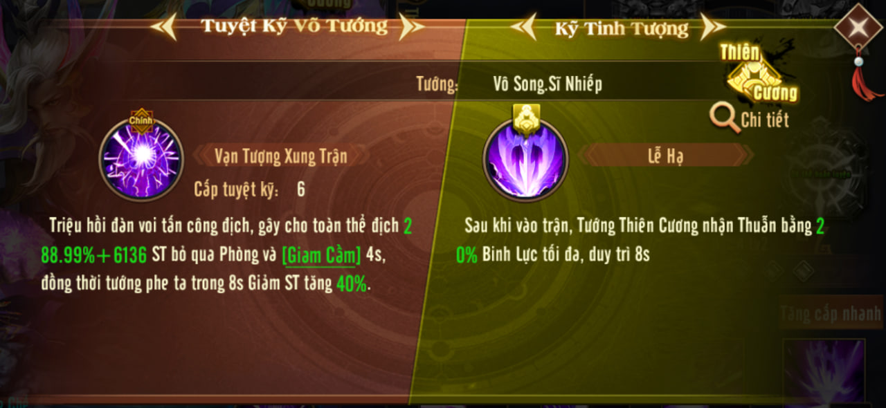 - Khi vào trận, toàn bộ tướng vàng phe ta nhận Thuẫn bằng 20% Binh Lực tối đa của Sĩ Nhiếp.