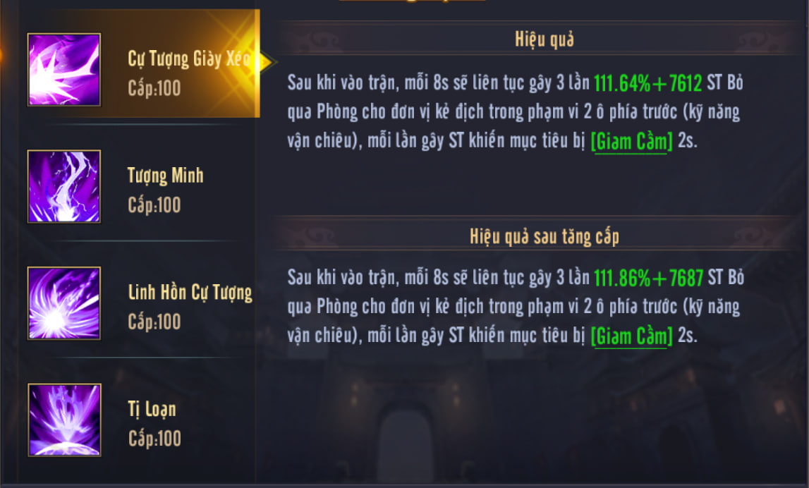 - Lưu ý: Giam Cầm là chắc chắn trúng. Đây là kỹ năng vừa khống chế, vừa cắt nguồn chiến ý - cực mạnh!