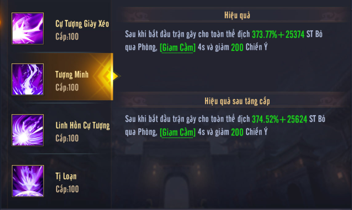 - 2. Đặc biệt kỹ năng 2 Tượng Minh có thể xem là bản nâng cấp của Lữ Bố: vừa khống chế toàn diện, vừa trừ chiến ý, lại còn sát thương bỏ qua Phòng. Dùng cả trong PK lẫn càn quét đều vô cùng lợi hại.
