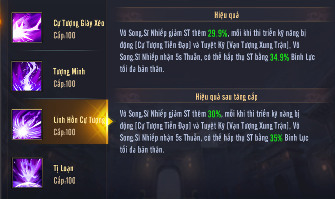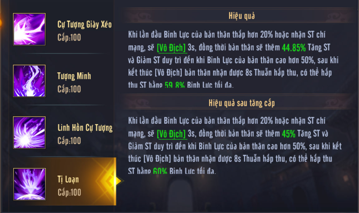 - 3. Khi hết trạng thái Vô Địch, lập tức nhận một Thuẫn bằng % Binh Lực tối đa, tồn tại 8 giây.