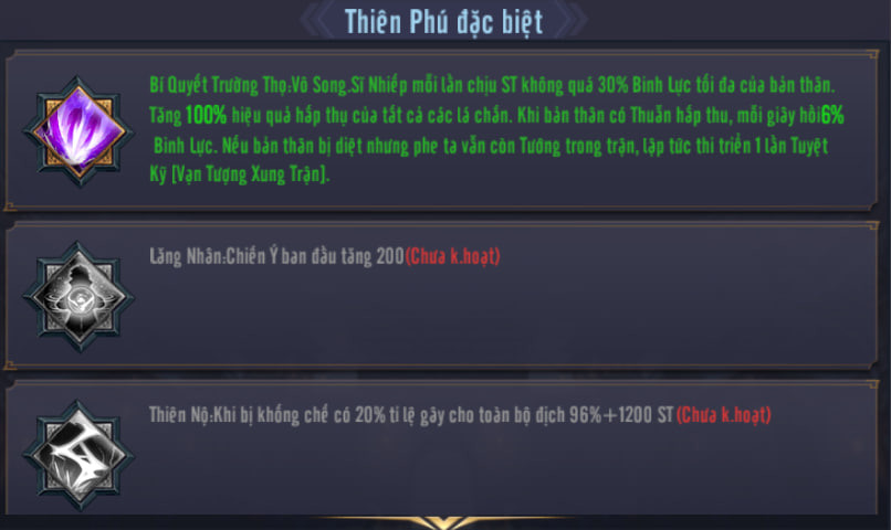 - Gợi ý: Thiên phú 1 là bắt buộc, tăng mạnh chống chịu + hồi phục, và còn thêm 1 lần khống chế toàn diện sau khi chết.