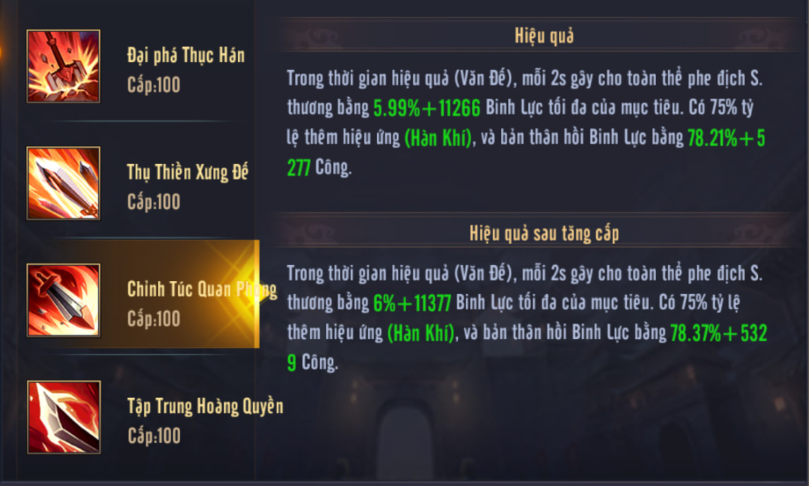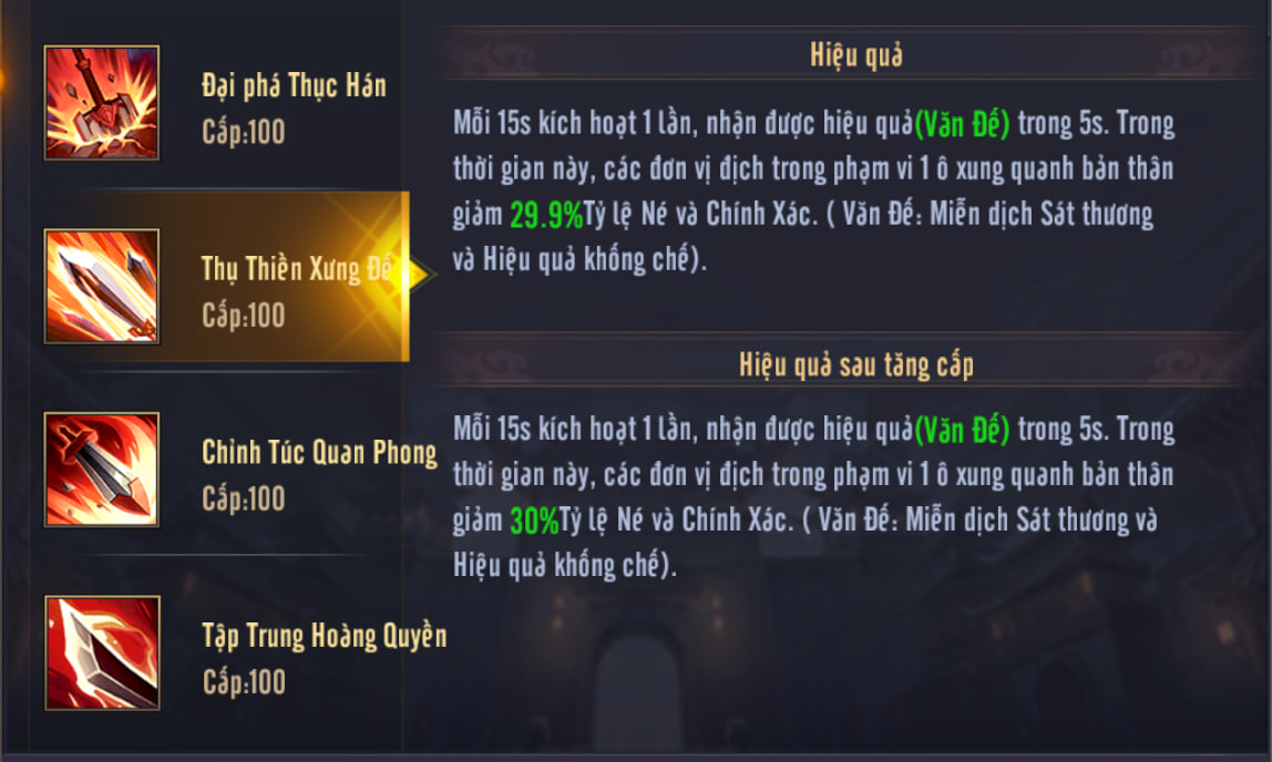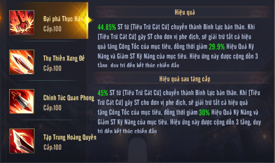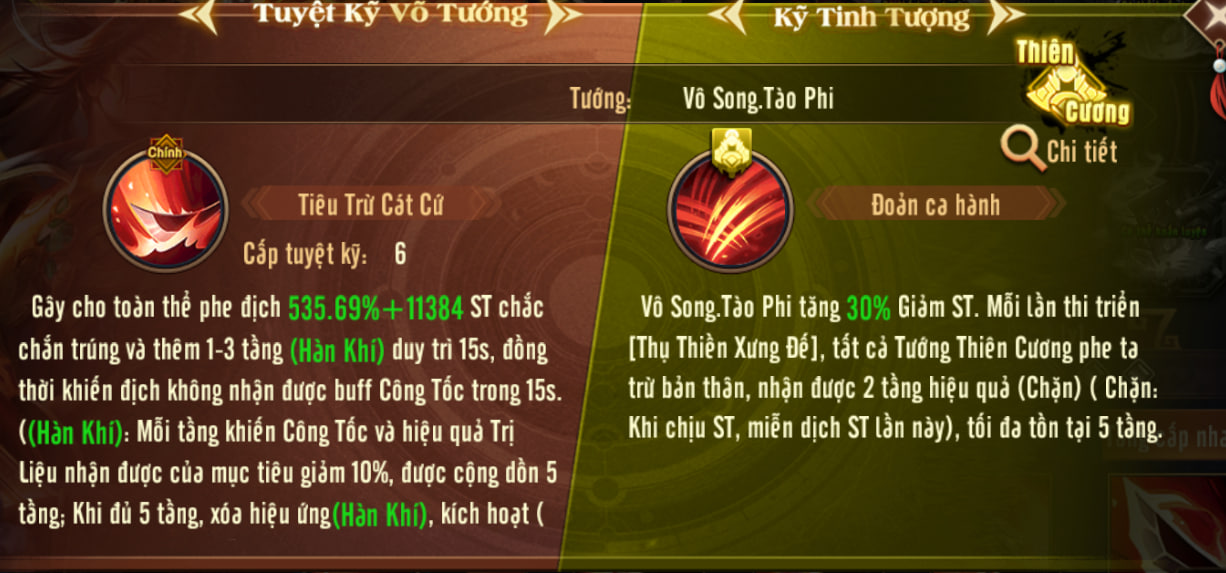 • 3. Khi gây sát thương bằng Tuyệt kỹ, hiệu quả kỹ năng và giảm sát thương kỹ năng của mục tiêu (tối đa 3 tầng, kéo dài đến hết trận).